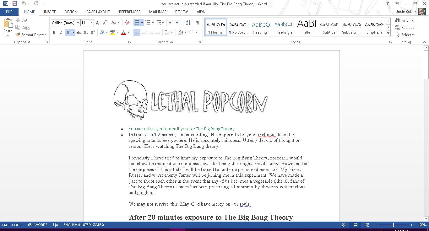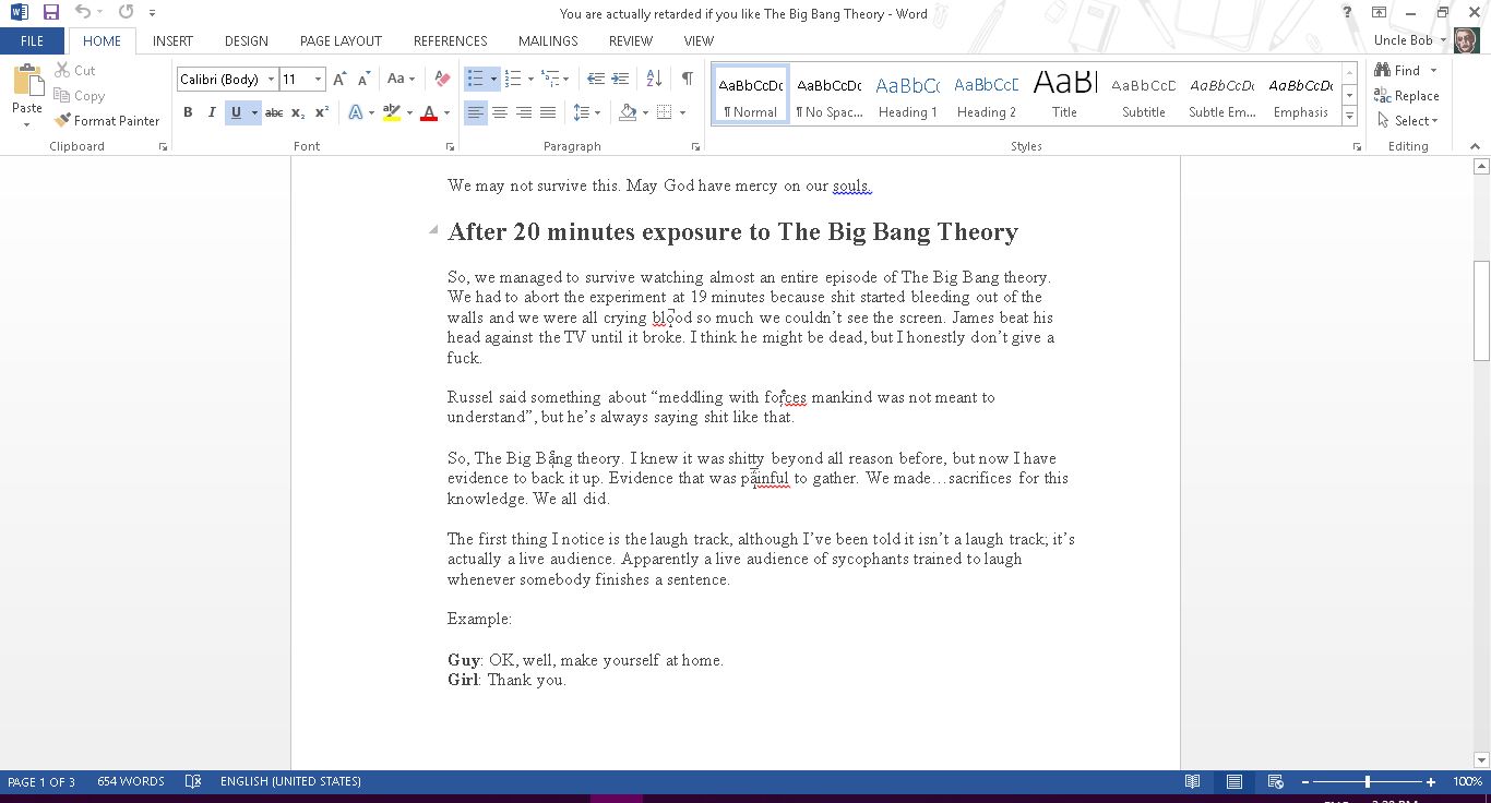 I Absolutely HATE The Big Bang Theory...The Laugh Tracks after ever look, movement, and stupid joke...ARGHHH!!! Torture!!! I'll drop a potential Friend or Girlfriend if they insist on making me watch that Steaming Pile of S**t. Parsons (Sheldon) I'd pick him up & throw him out of the window if I had the chance in TV World fantasy Land. I know I don't have to watch it; Just I never hated any other show in my life like this!