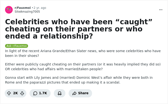 We’re featuring some of the biggest infidelity scandals sparked by celebrities, as shared by members of the ‘Fauxmoi’ online community in two viral threads. These stories might make you view your favorite celebs in a different light.