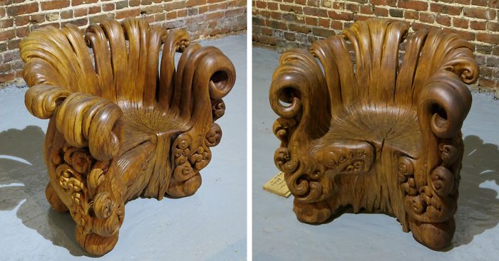 Carving wood is a two-way street: while you might have a clear vision of what you want to create, the wood’s knots and grain will often force you to adapt. That’s why this chair, carved by Alex Johnson from a single brown oak stump, is so impressive.