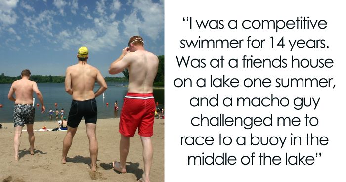 I was a competitive swimmer for 14 years, including 4 years of NCAA, but I'm on the shorter side so people don't assume I was any good. Was at a friends house on a lake one summer, and a macho guy challenged me to race to a buoy in the middle of the lake, to prove... something, I guess. The lake is deceptively large, about a half mile across, so I warned him that if he isn't a strong swimmer it could be dangerous. He was running out of gas after about 2 minutes, so I offered to let him off the hook, but he insisted he would finish. I went to the buoy and was swimming back when I found him floundering, so I lifeguard swam him back to the house. His ego took a deserved hit that day. Don't get cocky around water, even if you think you're a strong swimmer.