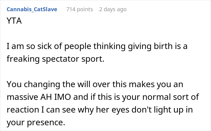 Okay, sorry for this emotional outburst, but I simply couldn’t help doing it. And many people in the comments to the original post did too. Some are even amazed that the original poster, after having a baby today, spent time writing an offended post on Reddit. And changing his will. “Your wife is still bleeding and you are having a tantrum about ‘why she doesn’t love me?'” someone wrote angrily.