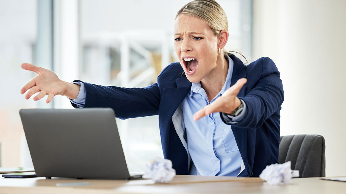 Office coordinator frustrated and shouting at laptop, showing limits tested by pushy colleague in a modern workspace.