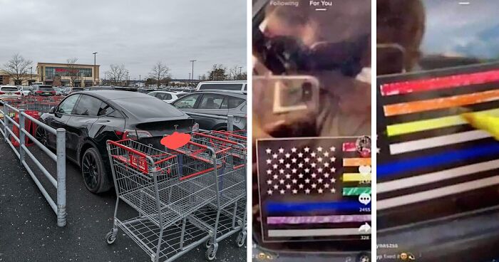 Black Tesla parked illegally in a shopping cart corral, showcasing a morally grey act shared in the chaotic good online group.