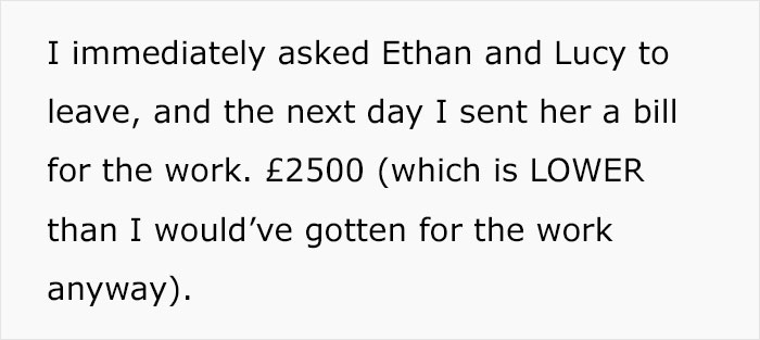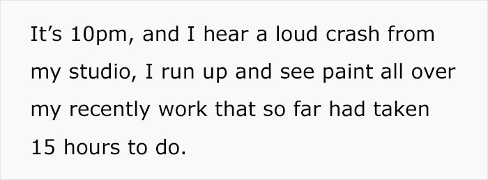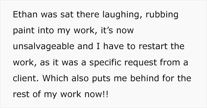 The next day, the OP sent a bill of £2,500, which would be about $3,400, to her sister as it was a commission. In the comments, the artist explained, “The £2500 is based on a few things. I will have to redo the painting as it was for a client. All the other items were destroyed. (The acrylics fell and he squirted them out. Very expensive acrylics!) The other time I will take me to redo the work (it was maybe 1/3 the way done) I will be receiving around £6000 for the work.” She also added that she wouldn’t have asked for money if the painting wasn’t an order from a client.