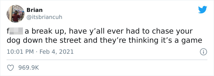 So when Brian, who goes by the Twitter handle @itsbriancuh, tweeted: “eff a break up, have y’all ever had to chase your dog down the street and they’re thinking it’s a game,” the tweet blew up on social media with 969.8k likes and 156k retweets, and it seemed that dog owners have totally found a safe space to talk about hard things.