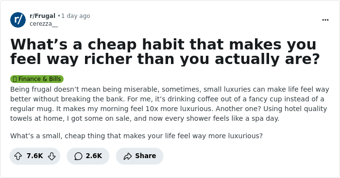 With this quote by Claire Luce, we conclude our thoughts: "Money can't buy happiness, but it can make you awfully comfortable while you're being miserable." Now we want to hear about your frugal things or habits that make you feel truly rich. Don't hesitate to share them in the comments below. Also, if you are able to relate to any of the things mentioned in this list, don't forget to upvote them!