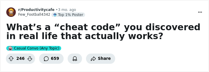 A Reddit thread from a few months ago discussed these “cheat codes” for a more fulfilling existence. Answers ranged from simple tasks, such as wearing sunscreen, to more complex actions like being intentional with everything you do.