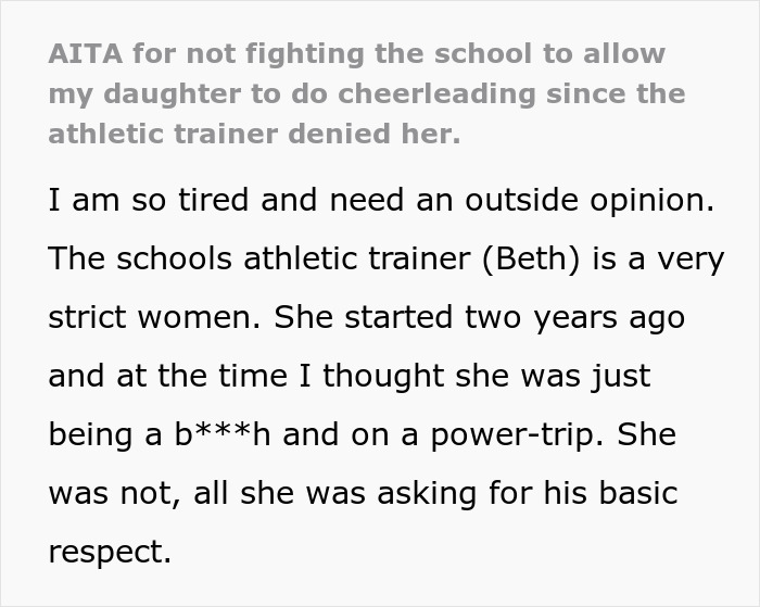 And so, the OP’s 15-year-old daughter needed teacher Beth to clear her for cheerleading. The girl was given a certain time when she should be at the teacher’s office. But she decided to go there after the practice when the teacher was packing up instead of at the given time. So, the teacher didn’t permit her to cheer. And the 15-year-old threw a fit about it.