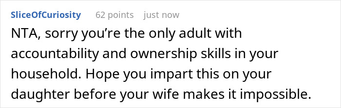 Unfortunately for her, the father refuses to do so. According to him, she treated the teacher poorly and deserved this. And this opinion “won” him the title of jerk, given by his daughter and wife.