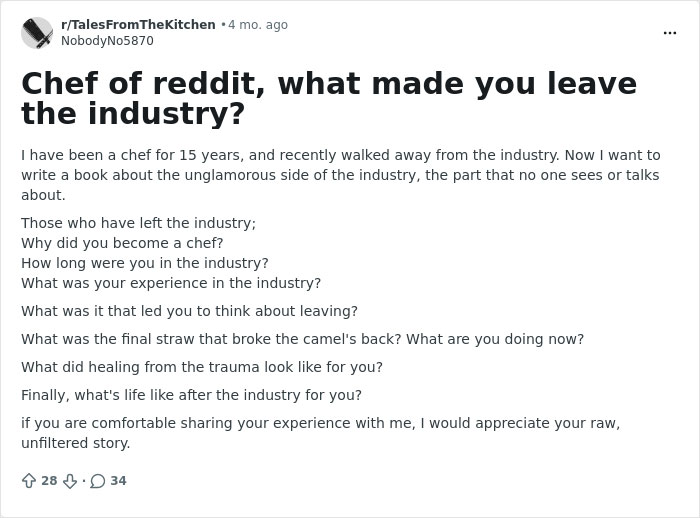 Someone asked “Chefs, what made you leave the industry?” and the folks who labor all day to cook for us took to the internet to tell their stories. So get comfortable as you scroll through, upvote your favorites and be sure to share your own thoughts and experiences in the comments down below.