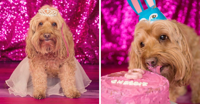 Chessie the Superstar is my 8-year-old rescue Cockapoo. She is adorable. I am a photographer. Therefore we had to do a cake-smash session for her birthday (cake made by a doggy bakery with doggy-friendly ingredients). We have four rescues total and they all attended the party. They dared not approach the cake however. The birthday girl wouldn’t allow it.