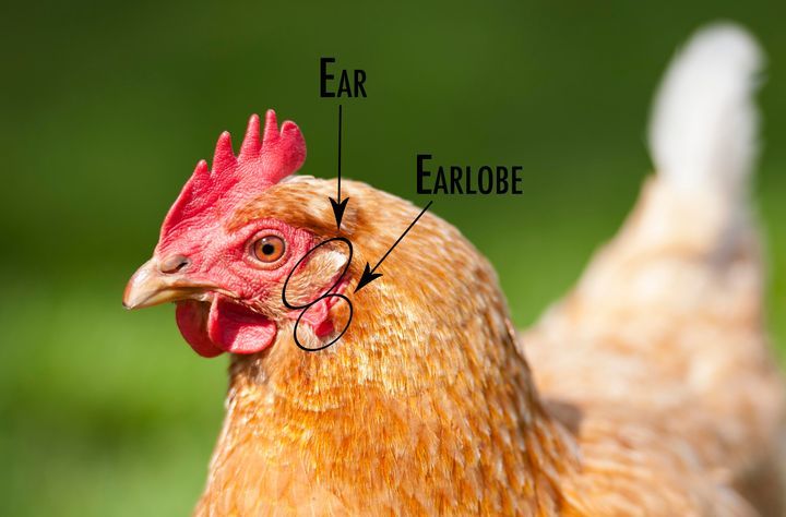 Ear lobe color seems to be related to egg color most of the time. Breeds with white earlobes usually lay white eggs (except for Penedesencas and Empordanesas). Chickens with red earlobes usually lay eggs in shades of brown (except for breeds and varieties like Easter Eggers, Ameraucanas, and Araucanas, which lay blue or green eggs)