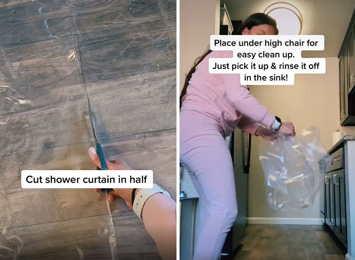 Cut the shower curtain in half. Place under high chair for easy cleanup. Just pick it up & rinse it off in the sink!