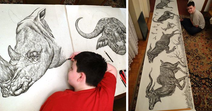 Serbian artist Dušan Krtolica began drawing when he was only 2 years old, barely able to hold a pen. He’s 15 now and has already had 6 solo exhibitions. Dušan loves the natural world, it’s his main theme. In fact, his animal drawings are anatomically correct, too. The boy even illustrated an encyclopedia a couple of years ago!