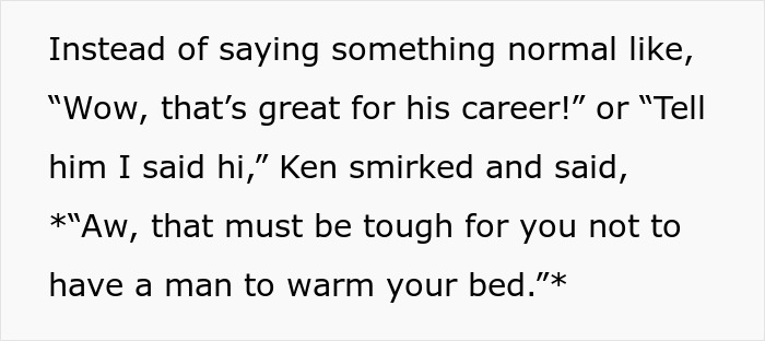 With a broad smile, the author congratulated Ken on his upcoming marriage, and told him that she was glad that he would finally lose his virginity and stop asking other people how it felt to have someone to warm their bed. There was silence – and a few seconds later it was shattered by the thunderous laughter of everyone gathered. Since then, Ken, as the OP admits, has never allowed himself to joke about her again…