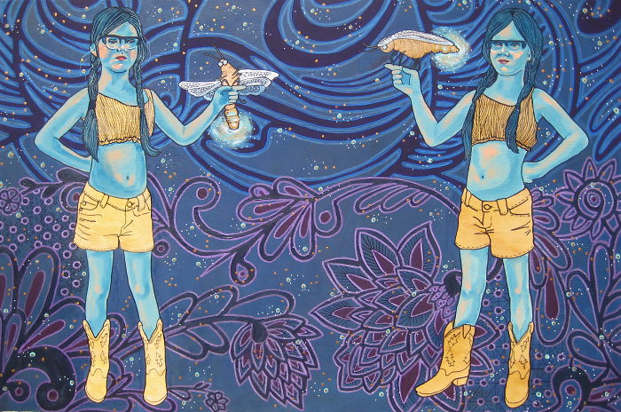 My work has a cast of children whose stance and attitude is full of the bravado, nonchalance and swagger of youth. It is very nostalgic and has a bit of a sense of humour. I see kids as these amazing creatures that are perfectly imperfect. Everyone seems to be in a rush to guide kids into adulthood and responsibility, but I’m happy if they want to hang out with a giant squirrel while wearing a Viking helmet and cowboy boots. I think childhood’s an amazing time and quite funny!