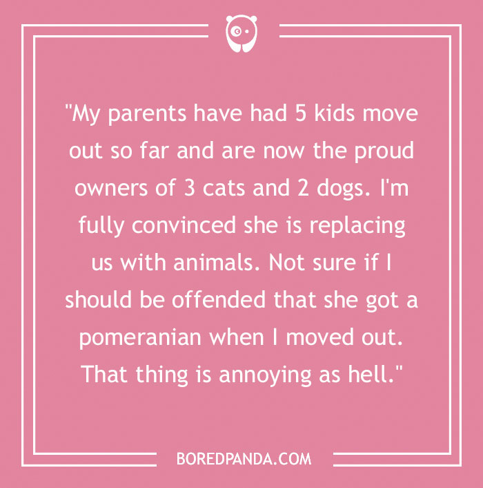 "My parents have had 5 kids move out so far and are now the proud owners of 3 cats and 2 dogs. I'm fully convinced she is replacing us with animals. Not sure if I should be offended that she got a pomeranian when I moved out. That thing is annoying as hell."