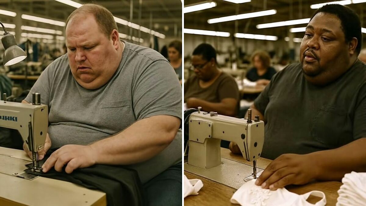 A viral AI-generated clip depicts obese, exhausted American factory workers under the new tariffs