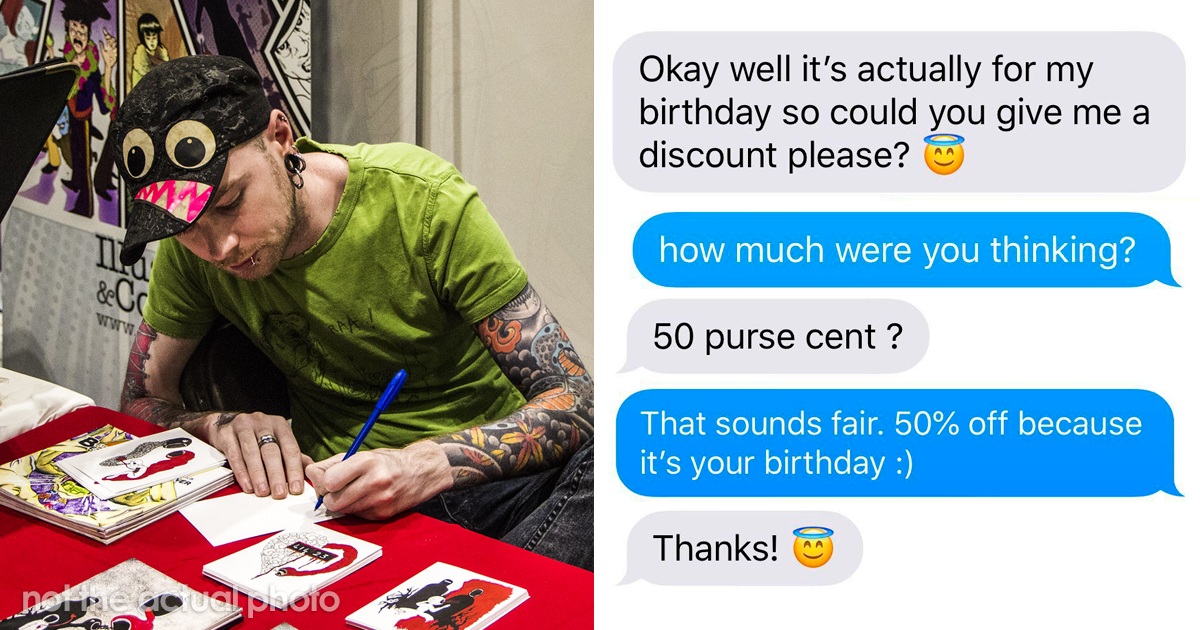 Choosing beggars are their own breed. They go through life using logic other people can’t even process and remain quite a mystery. However, reddit user /u/II-I-Hulk-I-II is one of the few people that understand it. Recently, when a potential client messaged them, asking for a 50% discount on their services because “it was their birthday,” the artist applied the same logic and quickly reduced them to curse words.