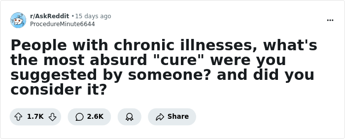 Chronic patients took to a brutally honest AskReddit thread to vent. They revealed the most ridiculous, absurd, and delulu pieces of advice they’ve ever gotten from people that were supposed to ‘cure’ their debilitating illnesses. Think lemon for migraines and meditation for epilepsy are bad enough? Well, they’re just the tip of the iceberg of awfulness.