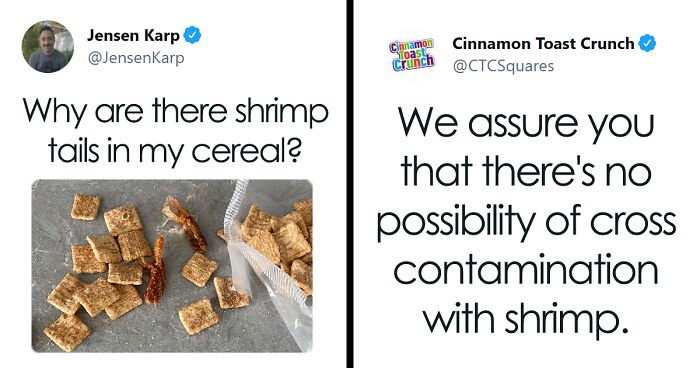 Jensen tweeted his unwelcome surprise and it blew up all over Twitter, amassing 128.9K likes and counting. The General Mills company then responded to his tweets saying it must be an accumulation of cinnamon sugar and that cross-contamination with shrimp was not plausible.