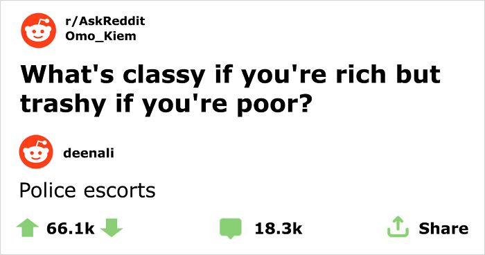 On September 25, 2015, “What’s considered trashy if you’re poor, but classy if you’re rich?” was first posted to r/AskReddit by user u/GreenAndPride. Know Your Meme reports that the post gained over 13K points before it was archived.