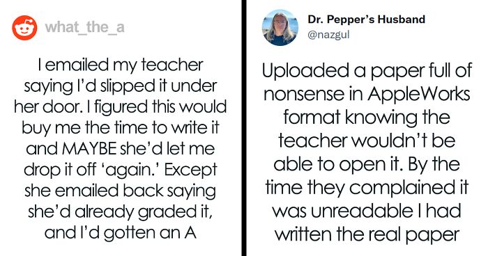 Load More Replies...These work because the teachers actually lose or forget assignments sometimes. In high school I once turned in an essay but didn't get it back with the others. I asked the teacher, he looked me in the eye and said very confidently "B". To this day I don't know if he remembered it was a B or made a deal with me to get a free B because he had lost it. Either way, was fine with me.