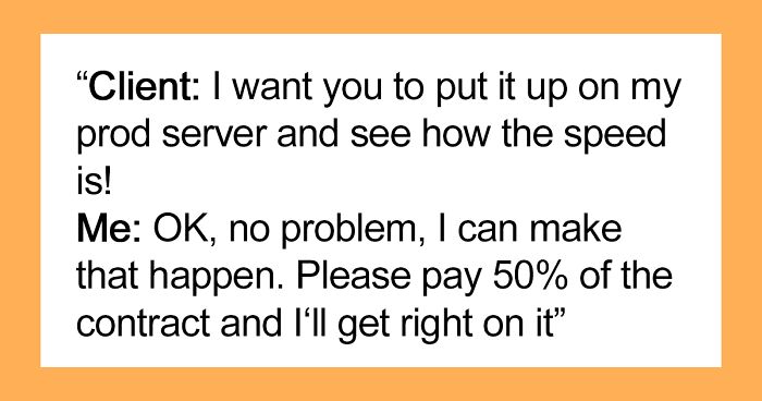 At the demonstration, the author could tell that the client was, in fact, happy, though he wouldn’t admit it, and instead decided to throw in some negative comments about things being wrong. Naturally, the thing that we all expected started to happen, and the client asked the freelancer to put the website up on their production server to see what the speed would be like. The OP agreed, but asked for 50% of the contract.