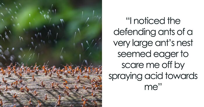 "I had been studying the lifestyle of wood ants in the Netherlands for work when I noticed the defending ants of a very large ant’s nest seemed eager to scare me off by spraying acid towards me. Luckily it wasn’t that destructive, and it provided me with a great opportunity to photograph them defending the nest."