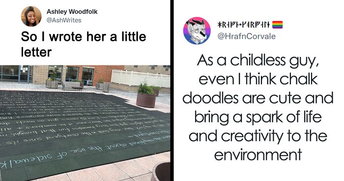 Load More Replies...I strongly dislike chalk on the sidewalks, because it's usually just an ugly, colorful mess, but I would NEVER say anything about it. They are kids, they need to play, draw, be creative, and chalk washes away with the first bit of rain! Why complain? I'll just walk by, dislike it for the few seconds I see it and move on with my life.