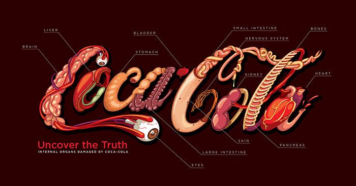 We all like to drink a refreshing coke sometimes, but this designer from Nicaragua, Fabio Pantoja, is a total addict to Coca Cola. Drinking too much of it, however, can damage your health, so Pantoja did this detailed re-design of Coca Cola’s logo with a dark twist: the letters depict the different organs and parts of your body that suffer damage after having too much soda.