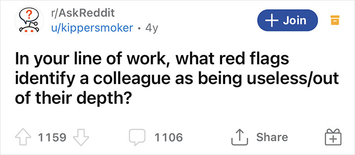 So when someone asked on Reddit “In your line of work, what red flags identify a colleague as being useless/out of their depth?” people had a bunch of stories to share. Sometimes it’s the new coworker lacking skill so badly you wonder how the hell they made it here, other times it’s a person who can’t take criticism or no for an answer. Sometimes it’s a colleague that’s always so silent that you wonder if they’re secretly binge watching The Office at their desk instead of doing their assignments.
