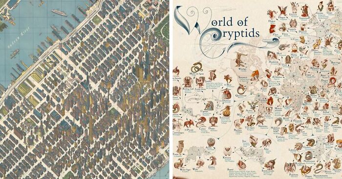 Illustrated by Laimutė Varkalaitė, the map of the world's cryptids shows the most famous or relevant cryptozoological being in each country. Its publication was included with a map of each continent and an illustration of home.