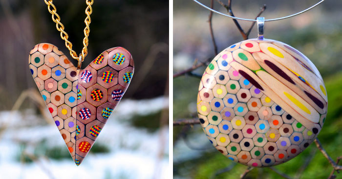 Jewelry designer Anna Čurlejová turns colored pencils into unique, wearable art. Depending on how they’re cut, either honeycomb dots or long lines of color allow for some truly creative jewelry. Lacquer keeps the pencil parts in place.