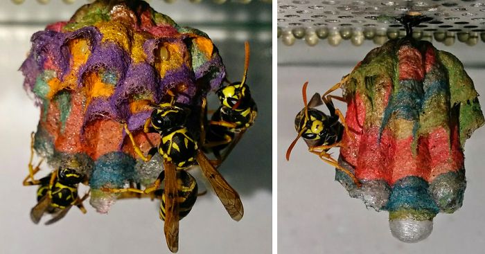 They’re the product of an experiment conducted by Mattia Menchetti, a biology student at the University of Florence. He realised that by giving a captive colony of European paper wasps different colored paper over time, the insects would eventually construct their own kaleidoscopic houses. And as you can see, the result is pretty remarkable, if not slightly reminiscent of a bad trip.