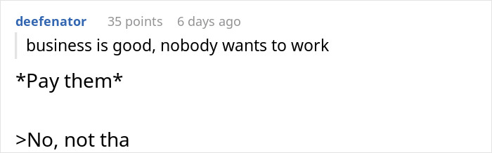 Both in TikTok comments and Reddit comments, people were guessing that the owner doesn’t pay decent wages and that the management at the restaurant is poor. People were convinced that what these kinds of owners don’t realize is that people don’t want to work specifically for them. They were also quite confused why the woman’s husband had to point that out when he wasn’t asked.