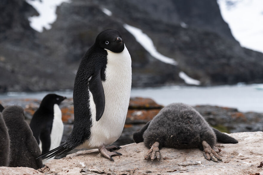 An Adelie penguin stands over its chick as it lays flat on the rock to cool off. Due to their high level of insulation, penguin chicks can sometimes overheat and lay on the rocks with their feet out to lower their body temperature. Shingle Cove, South Orkney Islands.