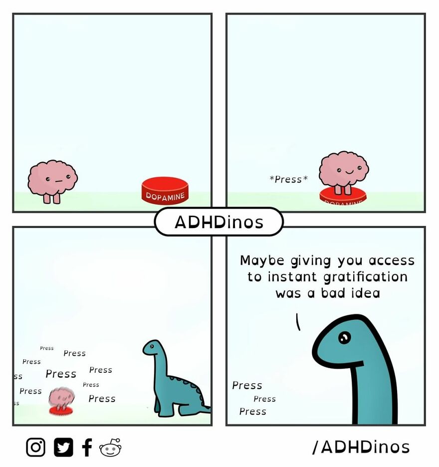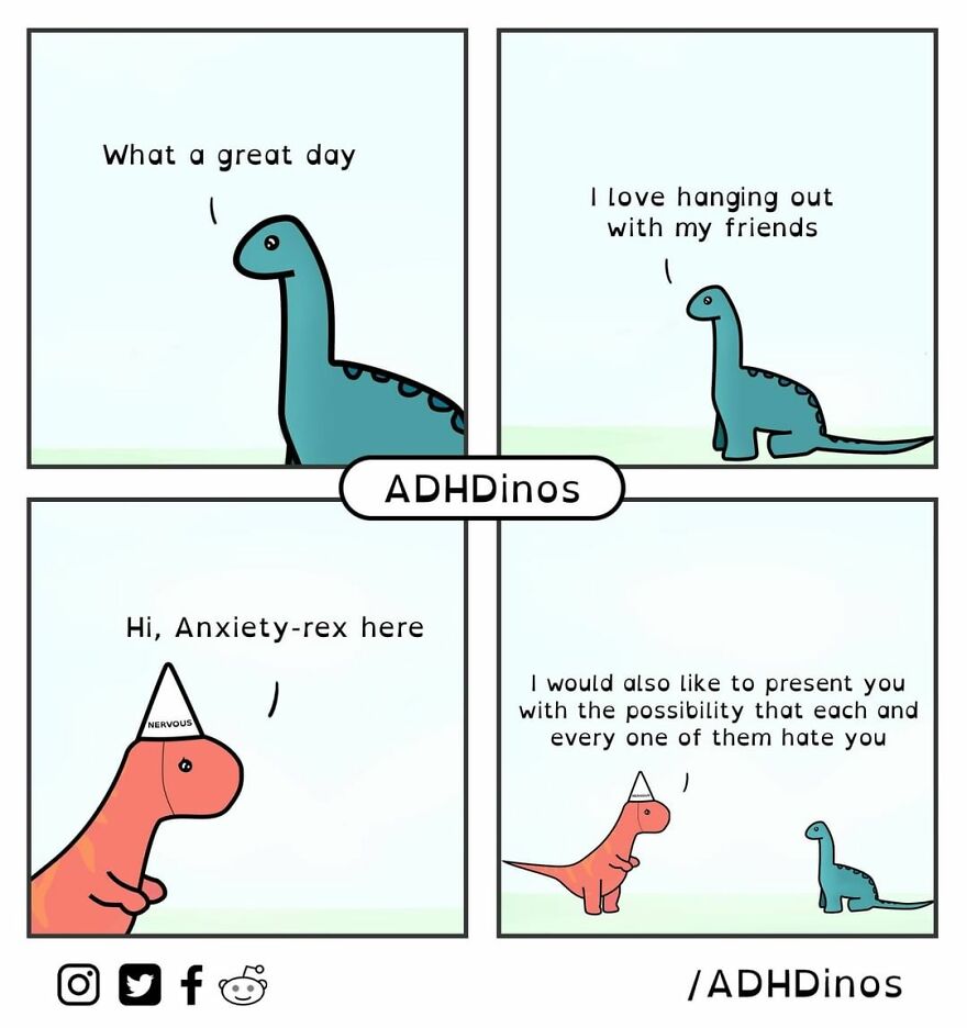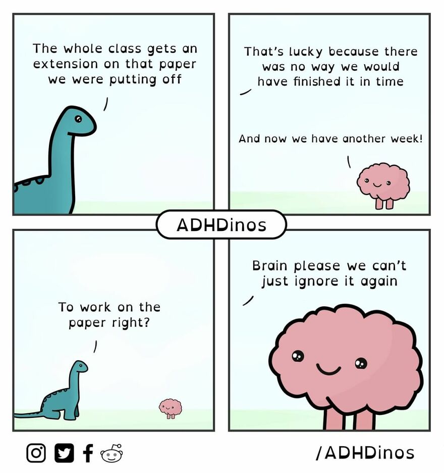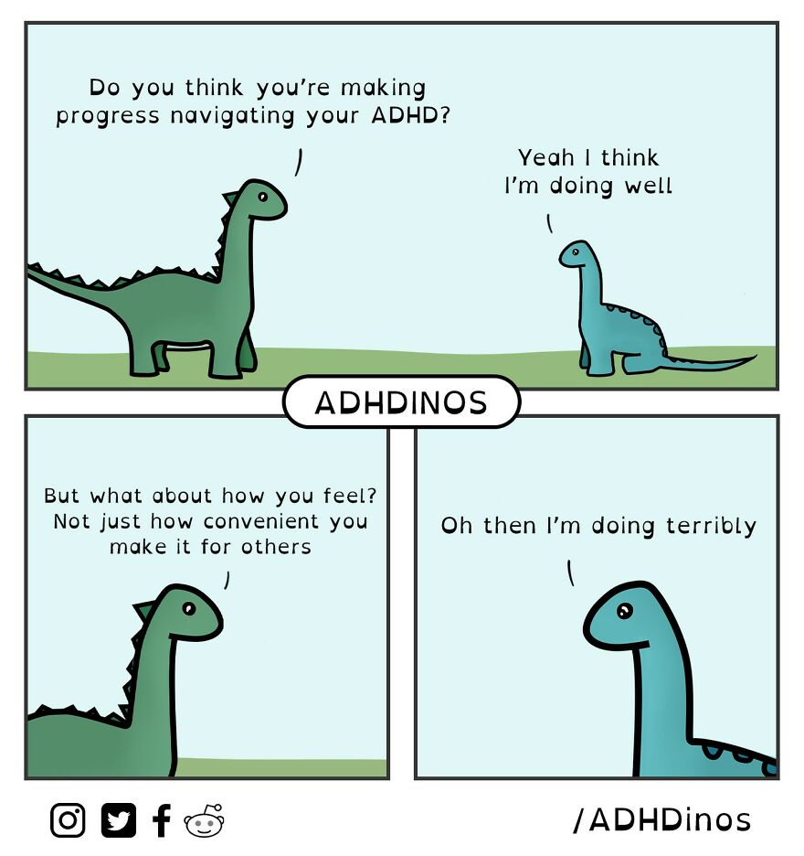 “ADHDinos is a webcomic about the daily struggles I (and many others) experience with ADHD. I was recently diagnosed with ADHD as an adult and felt like I was on my own. I was then surprised to find such a massive and supportive online community where I was able to learn how to better navigate many of my problematic behaviors,” the artist said in his previous post here on Bored Panda. Scroll down to see the newest additions to ADHDinos comics.