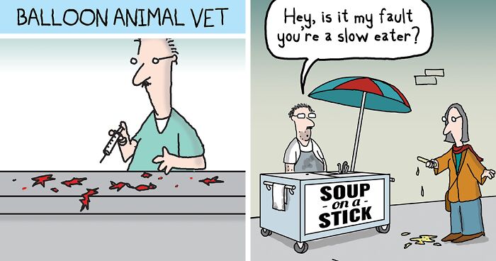 Bored Panda has reached out to Dave Blazek to find out more about his work. We wanted the artist to tell us about his background and how he got started working as a cartoonist. Blazek said: “I have a most unusual background. I never drew as a child. I never went to an art school of any kind. I accidentally became a cartoonist and learned to draw when I was 43 years old. I had a previous career working for The Philadelphia Inquirer newspaper as a graphic artist and radio and TV commercial director … eventually ending up as Creative Director of their in-house creative agency. I was also dabbling in standup comedy in and around Philadelphia. The editors of the paper would bring the comic strip submissions sent by syndicates by me for my opinion. After I kept saying they weren’t funny, they suggested I try making a comic then. Since I didn’t draw, my partner John Gilpin drew up 30 of my ideas and Loose Parts was launched with me writing the gags and John drawing them. Unfortunately, a year or so in, John had to drop out because of health reasons. So I had to quickly learn how to draw and Loose Parts has been both written and drawn by me for the last 23 years. Now that I’ve drawn over 9,000 of them, I think I have it down.”