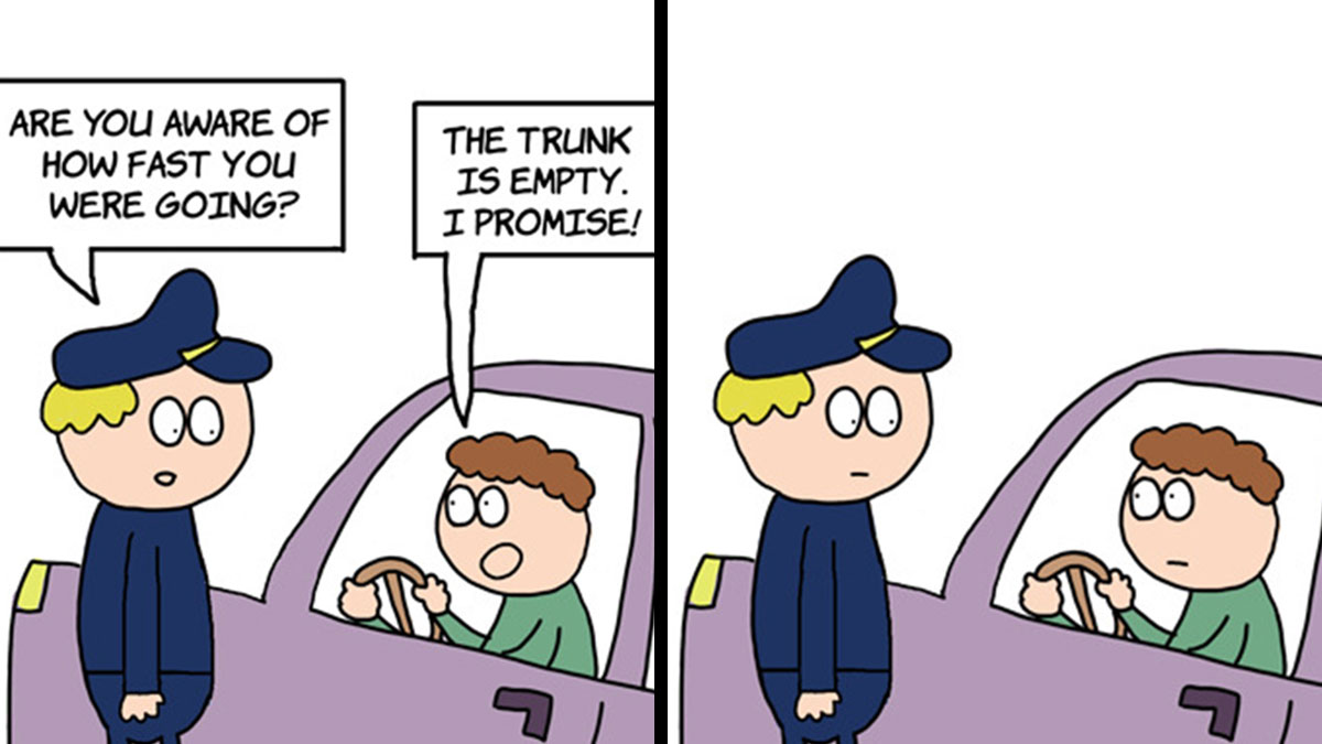 Comic with dark twists showing a police officer questioning a driver about the trunk, part of funniest comics with dark twists.