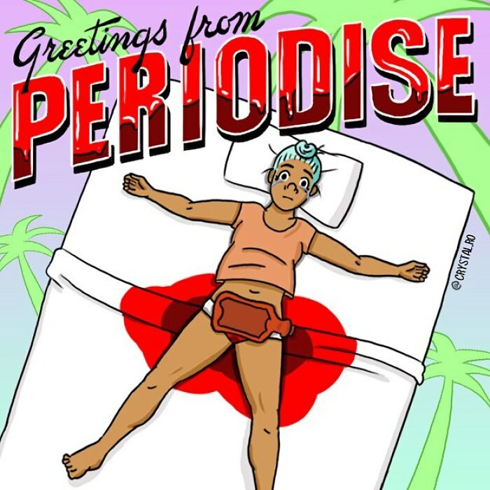 Perhaps there's no point stating the obvious, but Crystal's comics openly and frequently address a somewhat taboo subject, menstruation. A keen eye may notice that there are many hacks that Crystal uses to help her period symptoms. For example, she often depicts herself with a heating pad, which is known to effectively alleviate pain. Massaging the lower abdomen also helps relax the muscles. Others recommend taking a warm bath, or doing a light exercise to help increase blood flow. As for the bloating, many suggest eating healthy and drinking water. But don't feel bad if you feel lazy, weak, and want to snack all the time—it's not you, it's your hormones.
