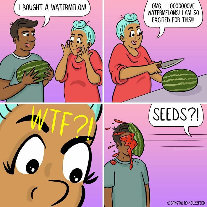 I'm not a woman, and I don't know much about being one, but judging by Crystal Ro's comics, the day-to-day of being a woman is filled with absurd moments, making it a great theme for comedy, or in Crystal's case, comics. Even though Crystal is a successful woman in her professional life (she works as a senior editor at BuzzFeed), her everyday life is full of little misunderstandings and problems, just like everyone else's. She finds a place in her comics to talk about "that time of the month," her relationships, mental health and many other things which most women relate to. But the comic is not only for women—I, personally, find it to be hilarious, and it also gives us an opportunity to learn about the feminine perspective towards everyday life. Have a nice read!