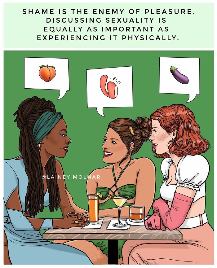 Bored Panda reached out to Lainey again to get to know more about her creative process. We asked her where she gets inspiration and motivation for her work. The artist replied that besides getting inspired by her own experience as a woman, she also follows a variety of content creators from psychologists, spiritual pages, body-positive influencers, mom influencers, and other inspiring people to "understand more about matters thousands or even millions of women go through."