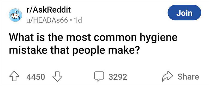 Started by platform user HEADAs66, it asked everyone what they think is the most common hygiene mistake people make, and in just a few days has received thousands of replies. Here are the most popular ones.