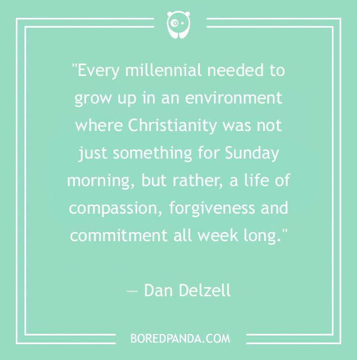 "Every millennial needed to grow up in an environment where Christianity was not just something for Sunday morning, but rather, a life of compassion, forgiveness and commitment all week long." — Dan Delzell