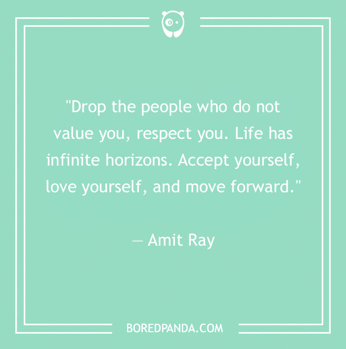 "Drop the people who do not value you, respect you. Life has infinite horizons. Accept yourself, love yourself, and move forward." — Amit Ray
