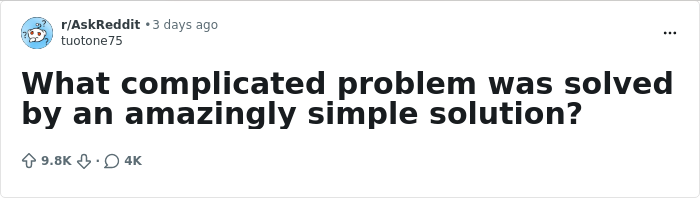 Someone asked “What complicated problem was solved by an amazingly simple solution?” and people from across the internet shared their favorite examples. So get comfortable as you scroll through, upvote your favorites and be sure to share your own thoughts in the comments down below.