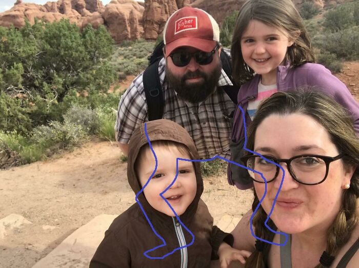 Load More Replies...What helped me immensely was the tiniest part of his pants you can see in the corner where his shirt, his (assumed) son's hood and the bush in the background meet.