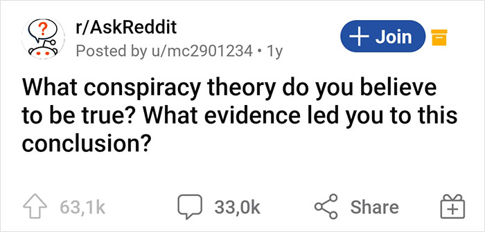 Thanks to a redditor who posed the question “What conspiracy theory do you believe to be true? What evidence led you to this conclusion?”, we are now able to do just that.