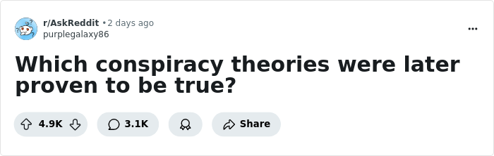When someone recently asked, "Which conspiracy theories were later proven to be true?" the internet didn't hold back. There were over 3,000 responses. And some might make you question the things you once believed. Bored Panda has put together a list of the top answers for you to scroll through while you wait for the next big conspiracy theory to hit. Let us know your favorites by upvoting them.